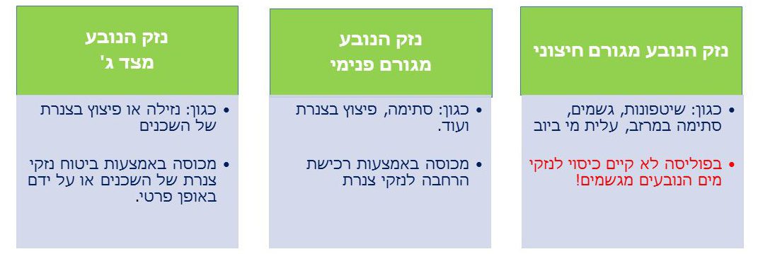 זה המקום לציין שוב כי בכל מקרה לא יהיה כיסוי בפוליסה לנזק הנובע מספיגת מי גשמים בקירות/ חדירת גשמים דרך התקרה בקומה עליונה, על כן חשוב לקרוא היטב את תנאי הפוליסה המלאים טרום רכישתה ולהבין גם מה לא מכסה.